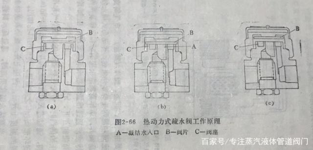 當(dāng)蒸汽開始供氣時(shí),首先在較低的壓力下空氣和冷凝結(jié)水流入疏水閥,通過進(jìn)入口孔托起閥片B,見圖2-66(a),并且從中間流到環(huán)形閥座C之空間里,再由出口孔排出。