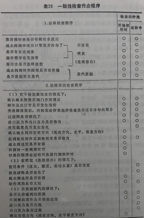 因此,要首先考慮和檢查蒸汽疏水閥以外的異常和故障,當確認不是這些外因之后,再開始解體檢查疏水閥,且必須采用一定的修理順序(參看表26)。